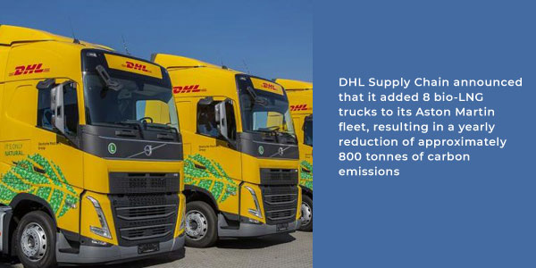 DHL Supply Chain announced that it added 8 bio-LNG trucks to its Aston Martin fleet, resulting in a yearly reduction of approximately 800 tonnes of carbon emissions. These trucks are significantly cleaner, with 78% less pollution compared to their diesel counterparts. Currently, they are being used at DHL's Wellesbourne and St Athan sites in the UK. DHL Supply Chain, as Aston Martin's logistics partner, handles inbound supply chain services at the St Athan site, providing transportation, inventory management, and warehousing support to the Gaydon production facility. Aston Martin's Racing Green sustainability strategy, launched in 2022, set a goal of achieving net-zero manufacturing facilities by 2030 and extending that target to the entire supply chain by 2039.